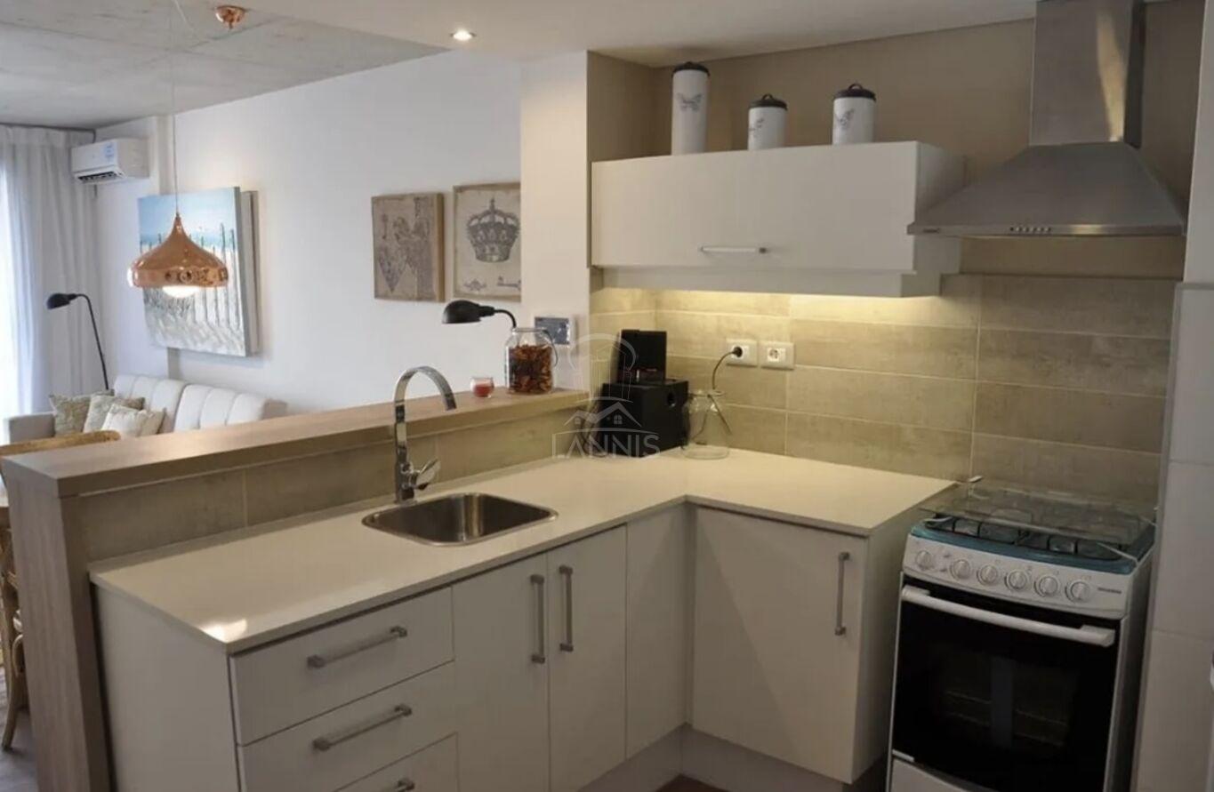 El apto se entrega con AA en living, calefon, horno, campana y cocina